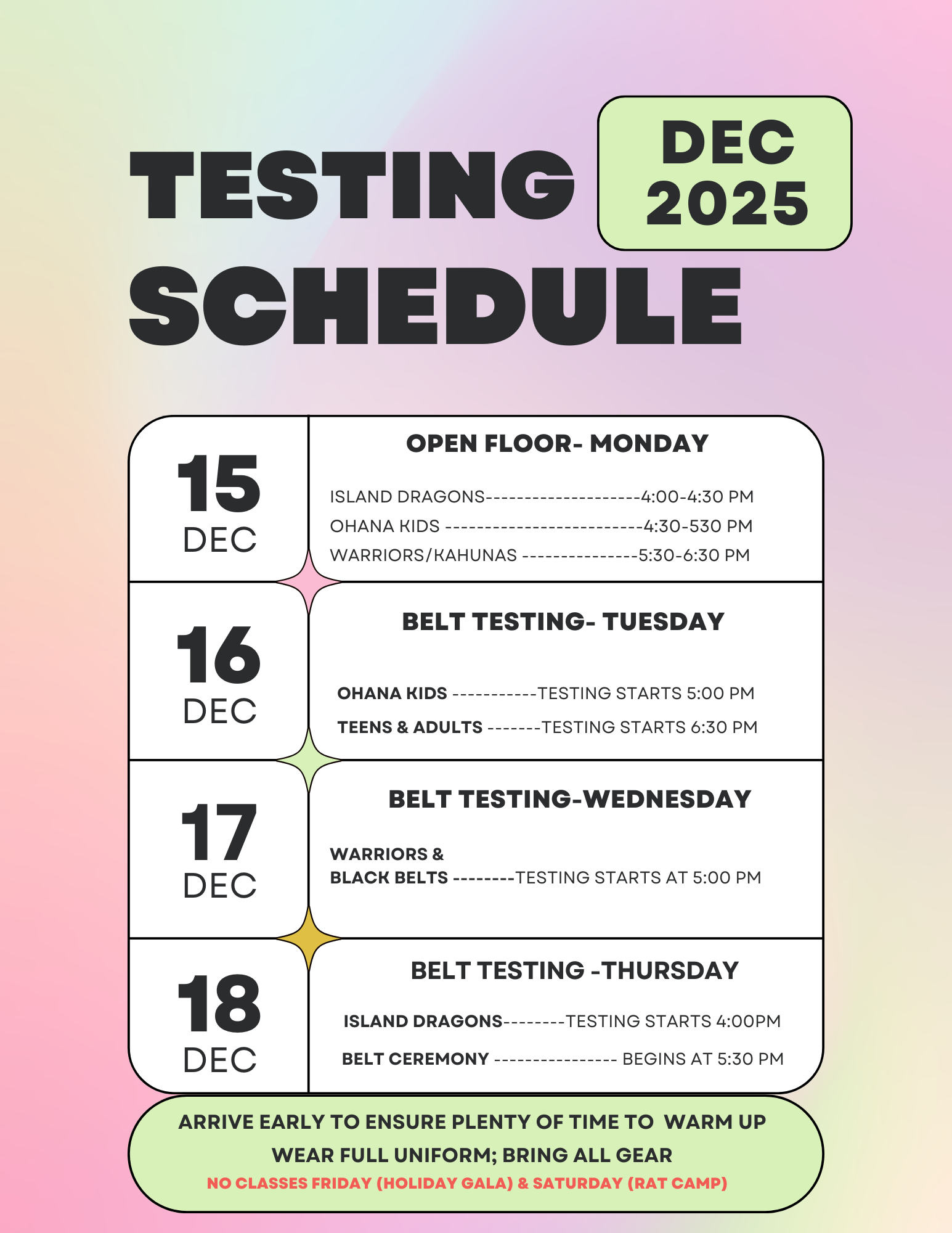 December 13th: Ohana Championship Tournament 8:30 am - 2 pm (No Saturday classes held)