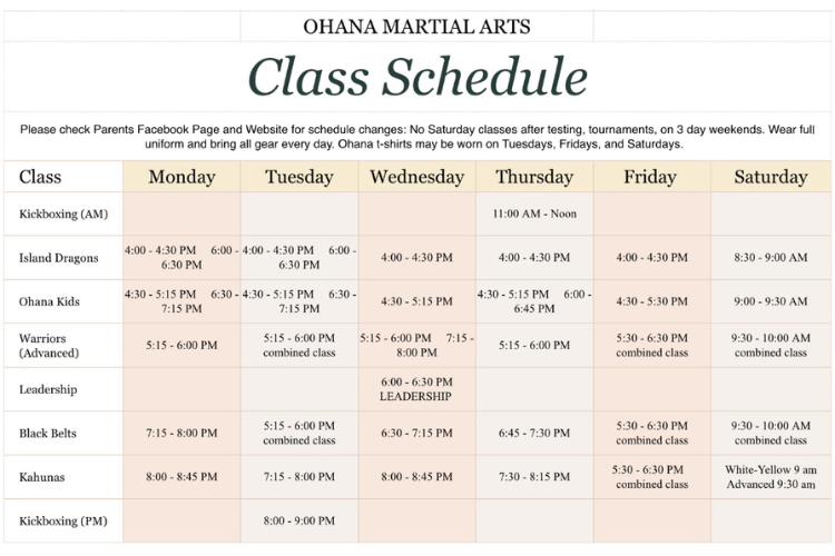 *NOTE: We have exceptions to our Saturday class schedule. Please join the Ohana Martial Arts Parents page after you sign up to view the Saturday schedule and updates or visit our website's NEWS page for latest announcements.